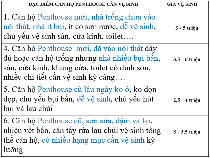 Giá dịch vụ vệ sinh căn hộ Penthouse