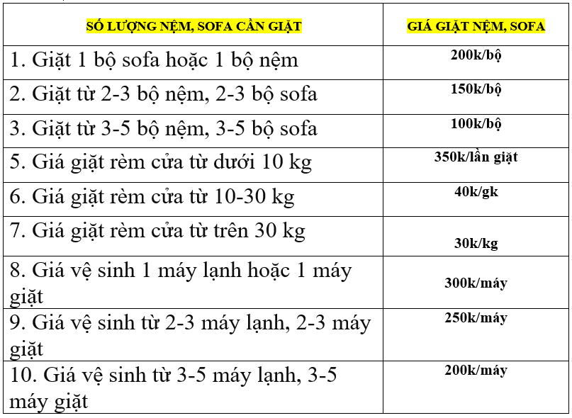 | Miễn phí giặt nệm, sofa | giặt, sấy khô |