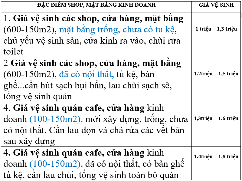 Giá vệ sinh các SHOP, mặt bằng kinh doanh