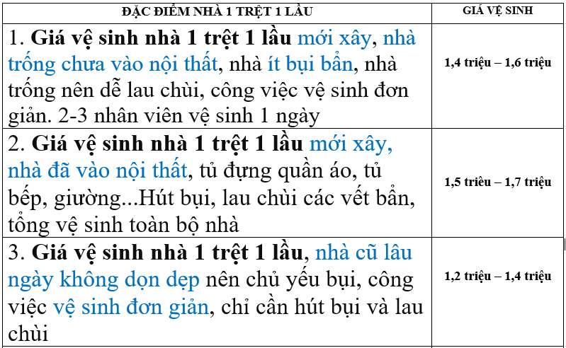 Giá vệ sinh công nghiệp nhà 1 trệt 1 lầu