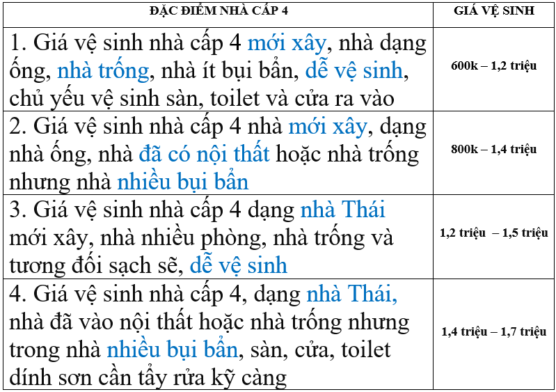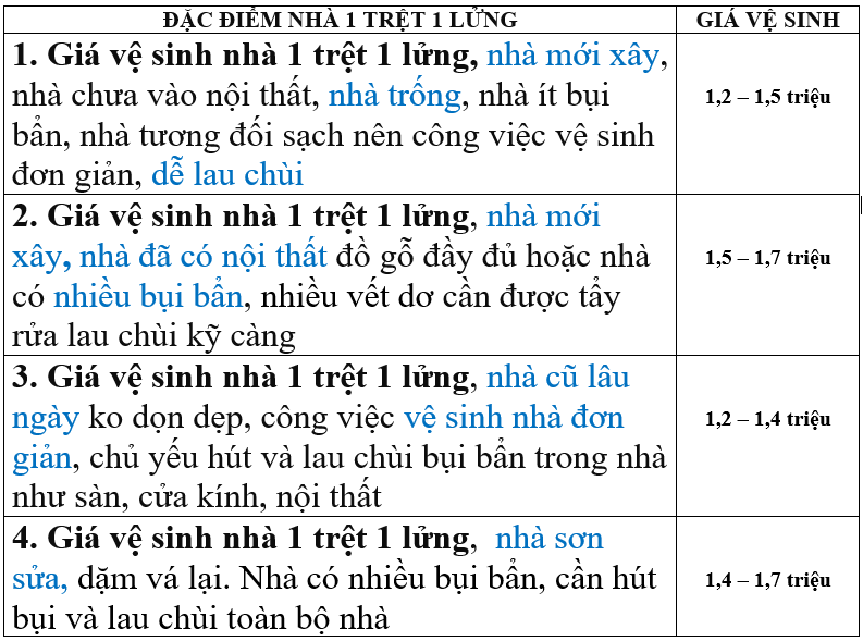 | Vệ sinh nhà sau xây dựng | 10-12.000đ/m² |