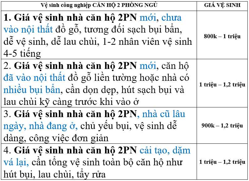 Giá vệ sinh nhà chung cư 2 phòng ngủ (60-80m²)