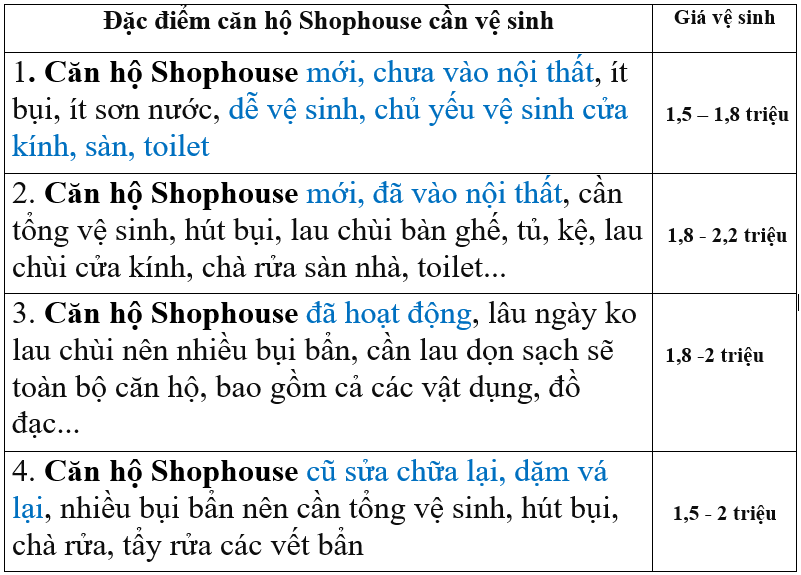 Giá dịch vụ vệ sih căn hộ dạng Shophouse