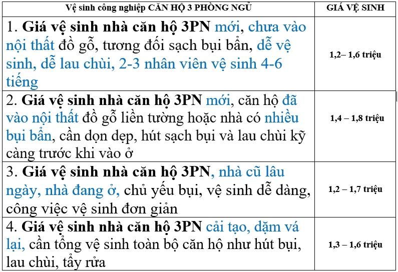 Giá vệ sinh nhà chung cư 3 phòng ngủ (90-120m²)
