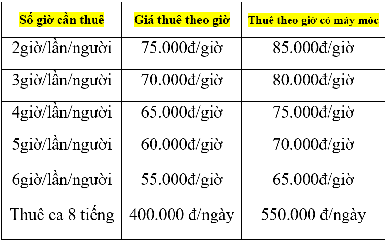 | Giá vệ sinh theo giờ | 55k/giờ |