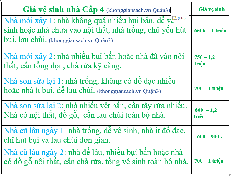 Giá thuê dịch vụ vệ sinh nhà ở Quận 3