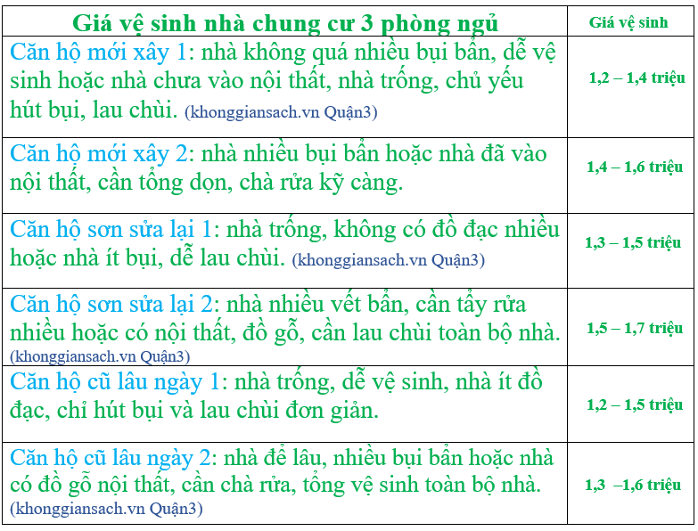 Giá thuê vệ sinh nhà căn hộ 3 phòng ngủ