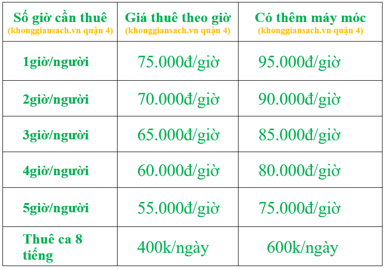 Hiện tại Khônggiansạch đang cung cấp dịch vụ vệ sinh theo giờ tại quận 4 với nhiều khung giờ khác nhau, tùy vào nhu cầu khách hàng có thể chọn số giờ phù hợp nhất.