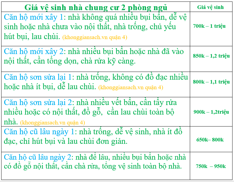 Giá vệ sinh nhà căn hộ 2 phòng ngủ
