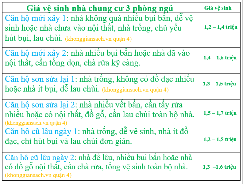 Giá vệ sinh nhà căn hộ 3 phòng ngủ
